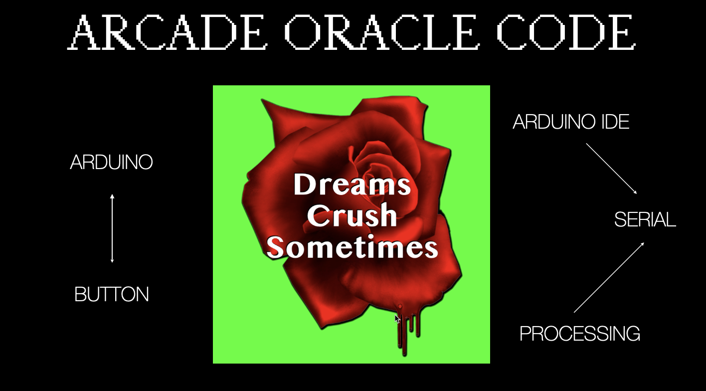 This Processing sketch displays a fortune-telling interface that shows three random words and a background image, which change whenever the user presses the spacebar or when an external arcade button connected to an Arduino sends a "pressed" signal through the serial port.